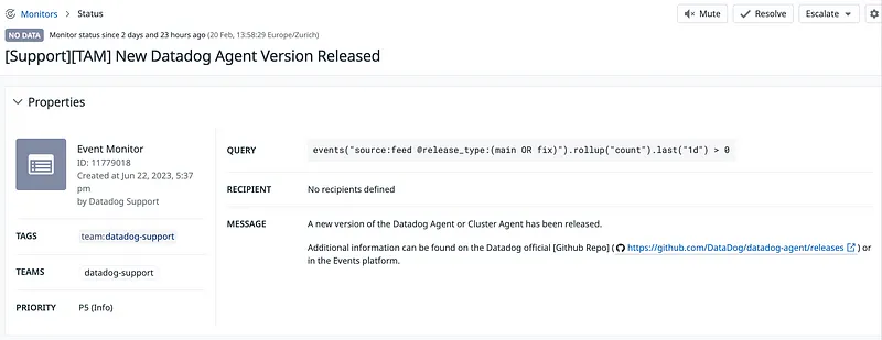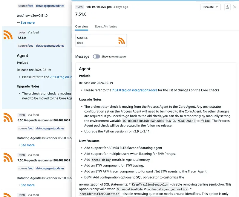 To illustrate, let’s explore how to leverage the event platform for sending notifications on new Datadog agent updates. Getting some events in the platform is the initial step. While native integrations like Kubernetes provide many events, custom events can also be submitted through scripts or emails.