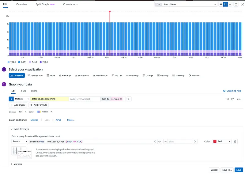 In the example below, we simply overlay on top of the number of agent running a bar when a new release is available. In other cases, it is often handy to overlay a app version change on top of latency and error rate graphs.