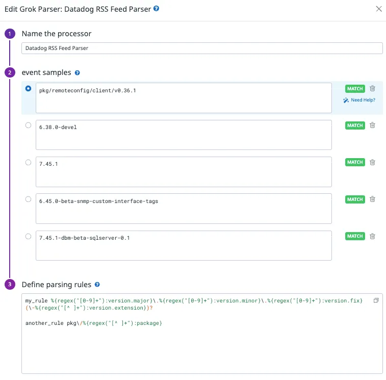 • Step 2: Implement a grok processor to effectively parse the message content and extract the new version number. Below is the grok parsing rule utilized. These rules will extract both the version numbers and their extensions.