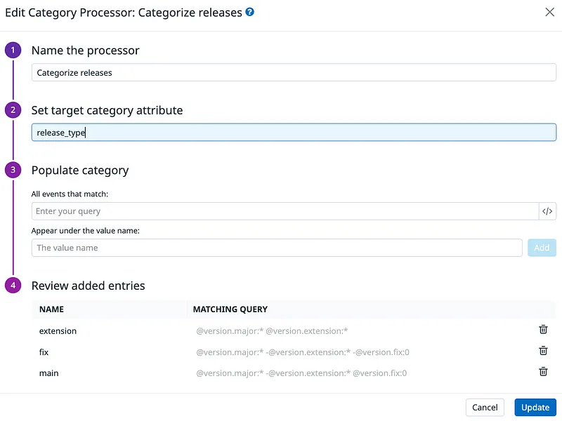 • Step 3 (optional): Employ a category processor to discern whether the version is minor, major, or an extension. Refer below for each category. (Side note: category processors are often under utilized but are very powerful to organize the incoming data.)