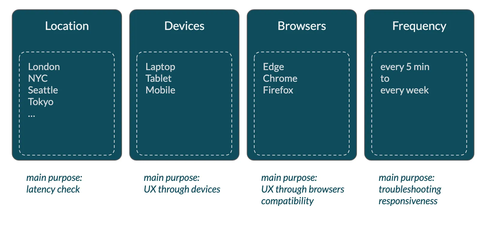 Beyond location, browser and device diversity plays a crucial role in UX. A page might load perfectly on Chrome but break on Firefox or Safari. Synthetic browser tests allow you to validate experiences across platforms like: