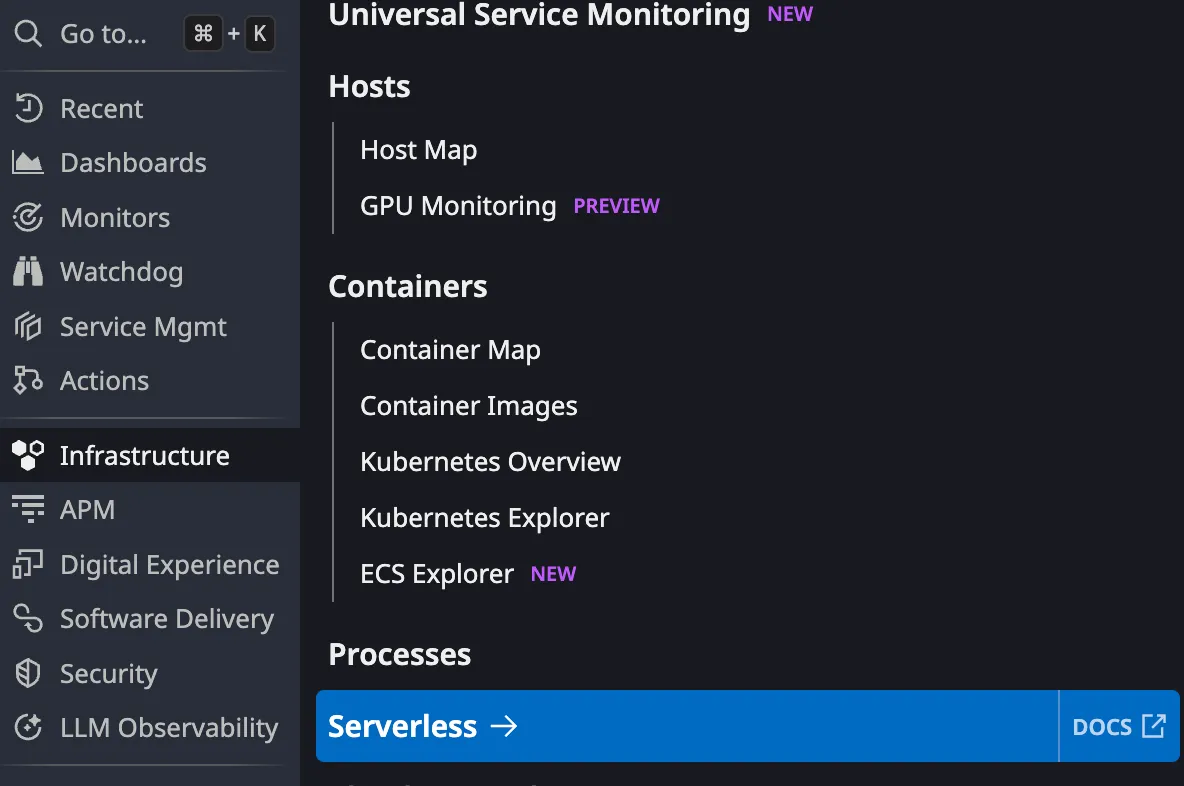 Datadog Menu to navigate to the Serverless View
