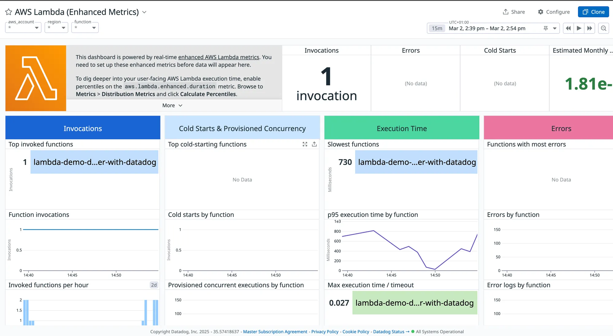 Default AWS Lambda Dashboard with Enhanced Metrics in Datadog