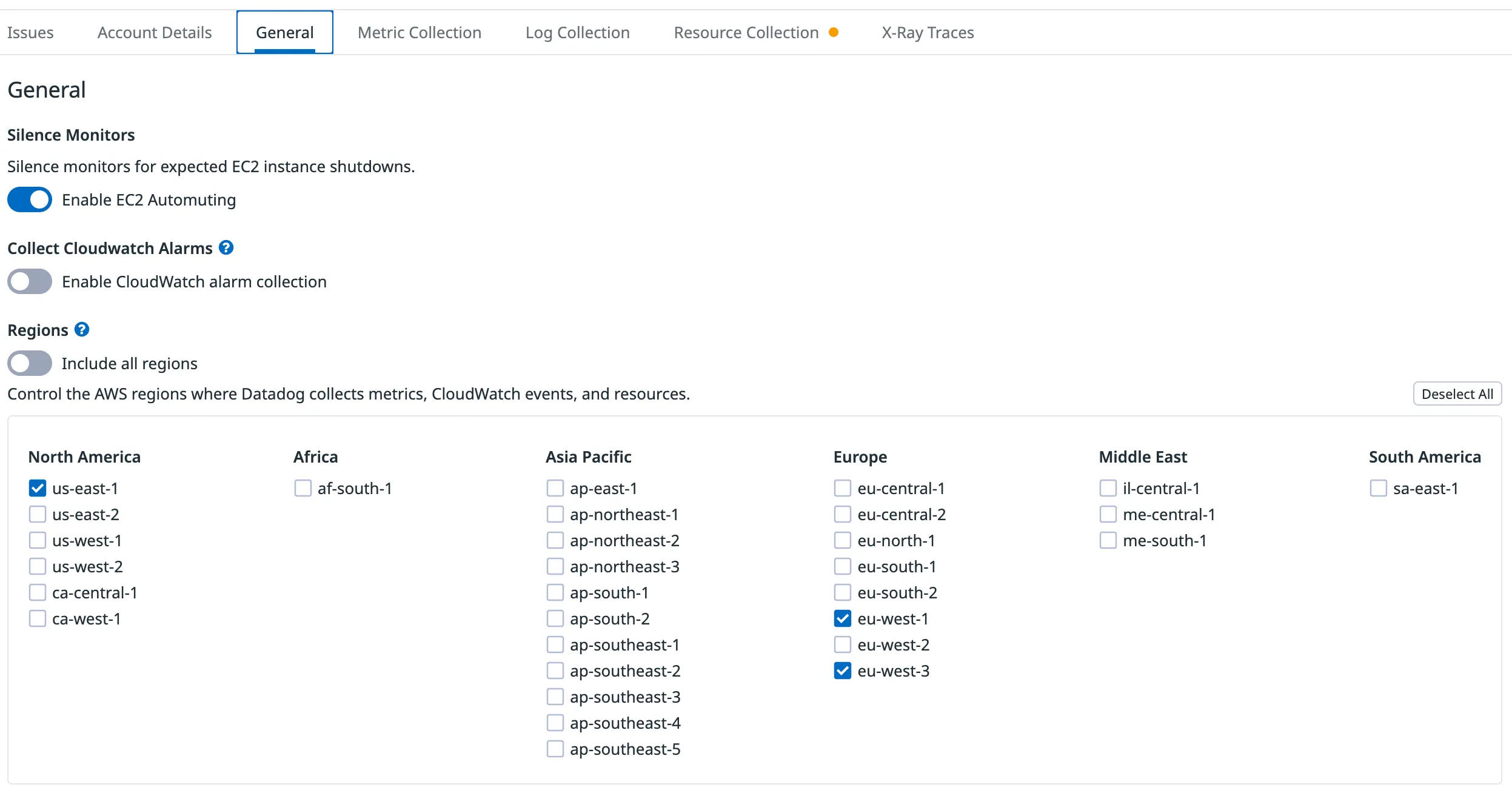 AWS Integration Configuration for Selected Regions
